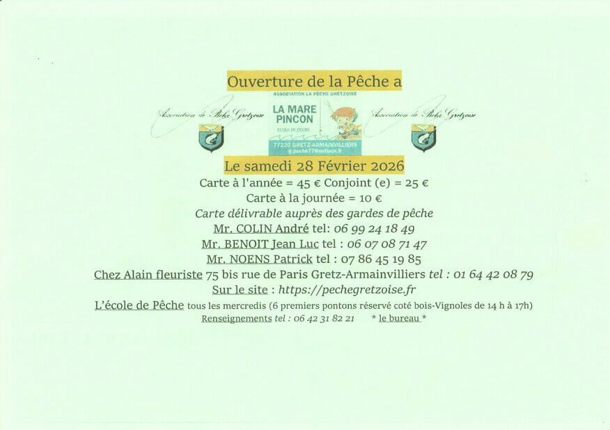 Vente de cartes auprès du Garde pêche tél: 06 42 31 82 21 ou 06 99 24 18 49